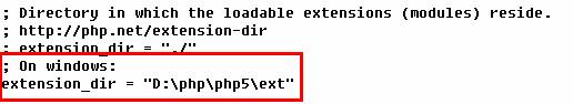 1、找到; extension_dir = ”./”這行,修改為extension_dir = ” D:\php\php5\ext” (注意去掉前面的“;“)