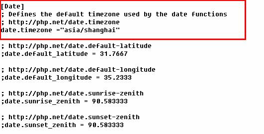 2、;date.timezone = 修改為 date.timezone =”asia/shanghai” (注意去掉前面的“;“引號為英文引號)